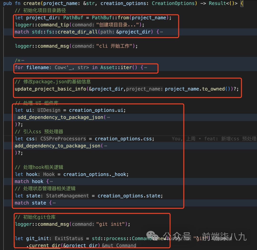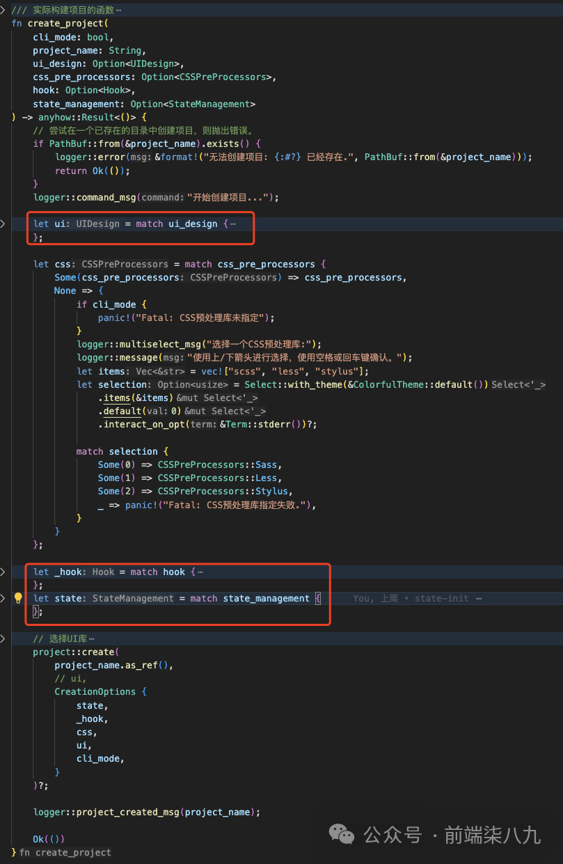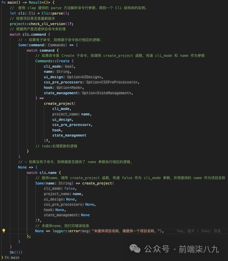 看到上面内容中,我们通过cli的提示,来告诉大家需要执行哪些步骤。而这一步的操作是在main.rs中create_project()中执行完project.create()后 执行logger::project_created_msg(project_name);输出的内容。