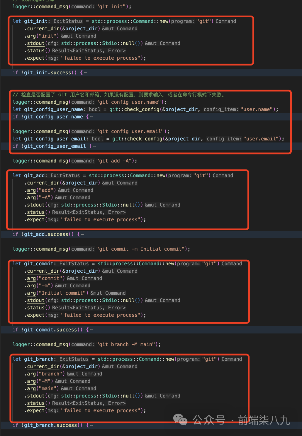 .status()执行命令并获取其退出状态。这个函数会等待命令完成并返回一个包含状态信息的Result类型。.expect("failed to execute process")处理Result,如果命令执行失败(例如因为git不在系统路径中),程序会输出错误信息并 panic。