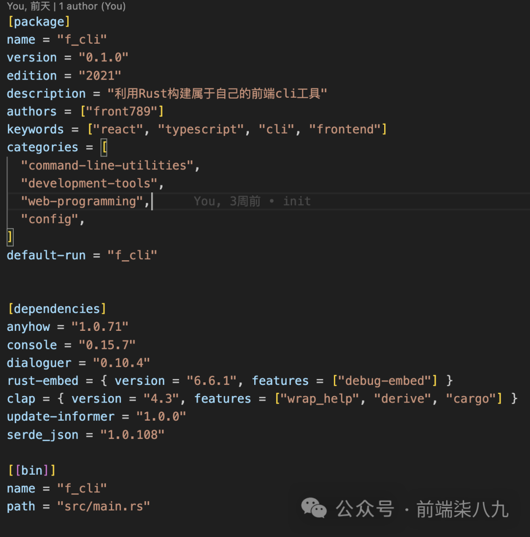 [dependencies]所以,我们第一步的操作就是处理Cargo.toml的配置信息。下面我们就直接贴出了,我们项目最后的配置内容。里面的[dependencies]我们在下面代码讲解中介绍。