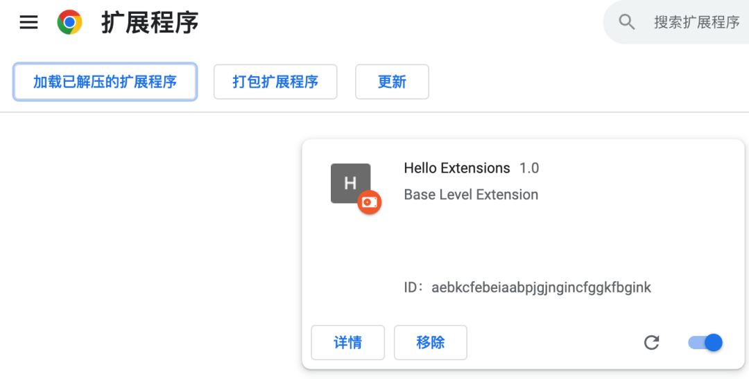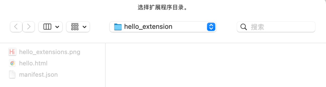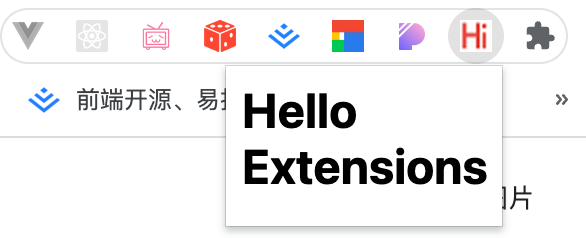 { "manifest_version": 3, "name": "Hello Extensions", "description": "Base Level Extension", "version": "1.0", "action": { "default_popup": "hello.html", "default_icon": "hello_extensions.png" }}上面的 JSON 文件描述了扩展的功能和配置,比如 action 中描述了在 Chrome 中需要显示的扩展的图标以及点击图标后弹出的页面。可以在这里 下载 图标到你的目录下,然后把名字改为 manifest.json 中配置的 default_icon。