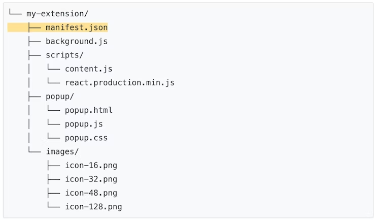 扩展工程结构可以有多种方式,但是 manifest.json 文件必须位于根目录,下面是一种结构实例。