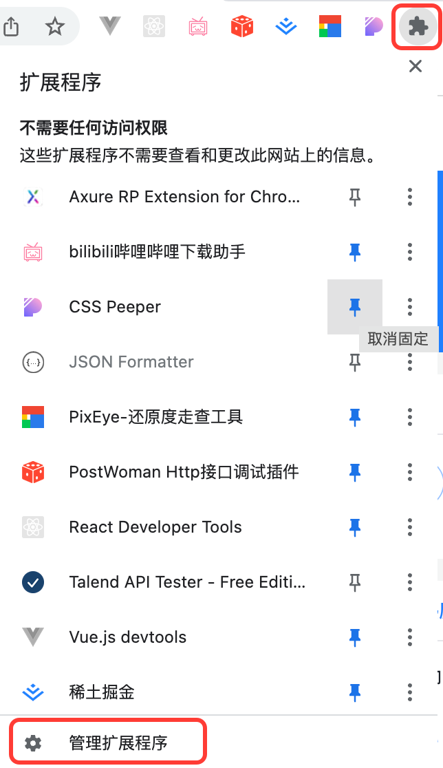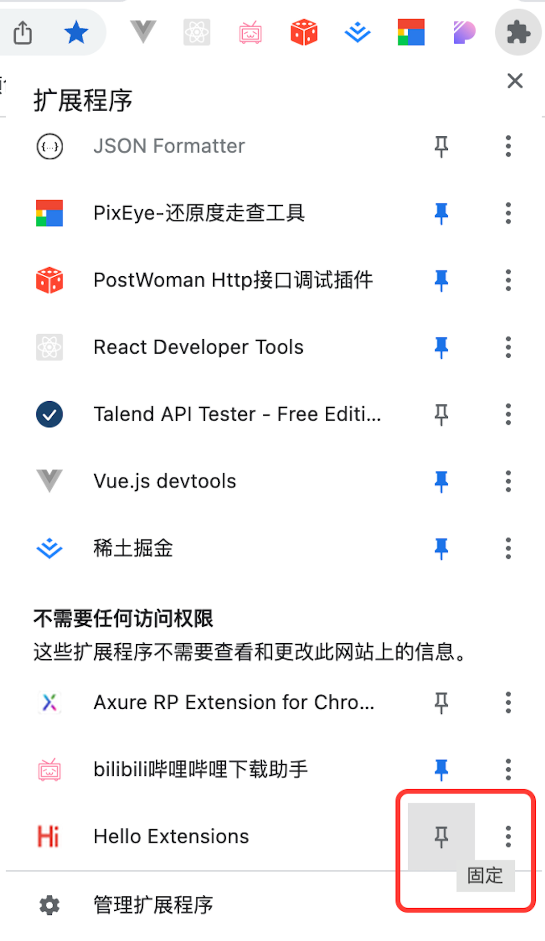 点击固定,我们的扩展就可以在工具栏显示了。然后我们点击 icon,就可以弹出对应的页面了。
