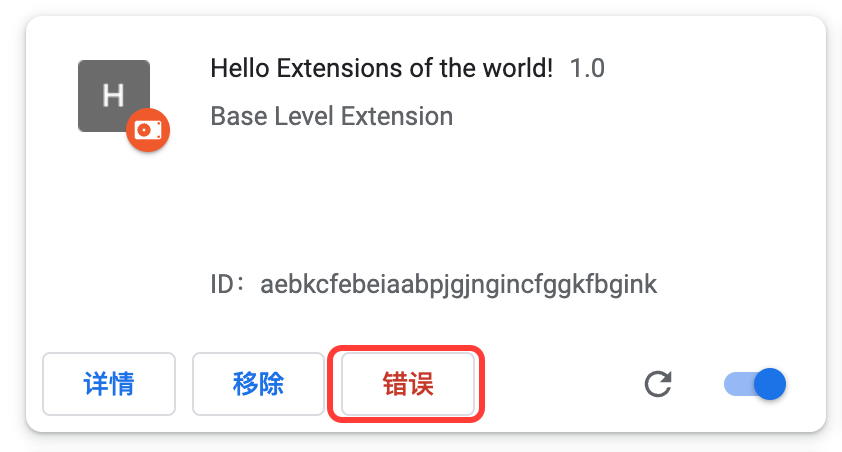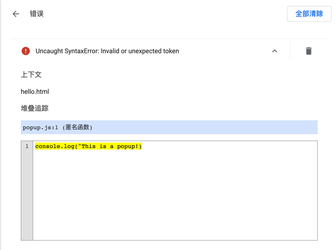 console.log("This is a popup!) // ❌ 错误代码刷新之后,然后再点击打开扩展,可以看到错误按钮出现。点击错误按钮,可以查看具体错误信息。