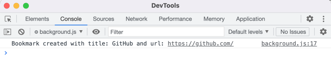 /** * 注意需要声明权限 */chrome.bookmarks.onCreated.addListener(function (id, bookmark) { console.log( "Bookmark created with title: " + bookmark.title + " and url: " + bookmark.url );});image.png