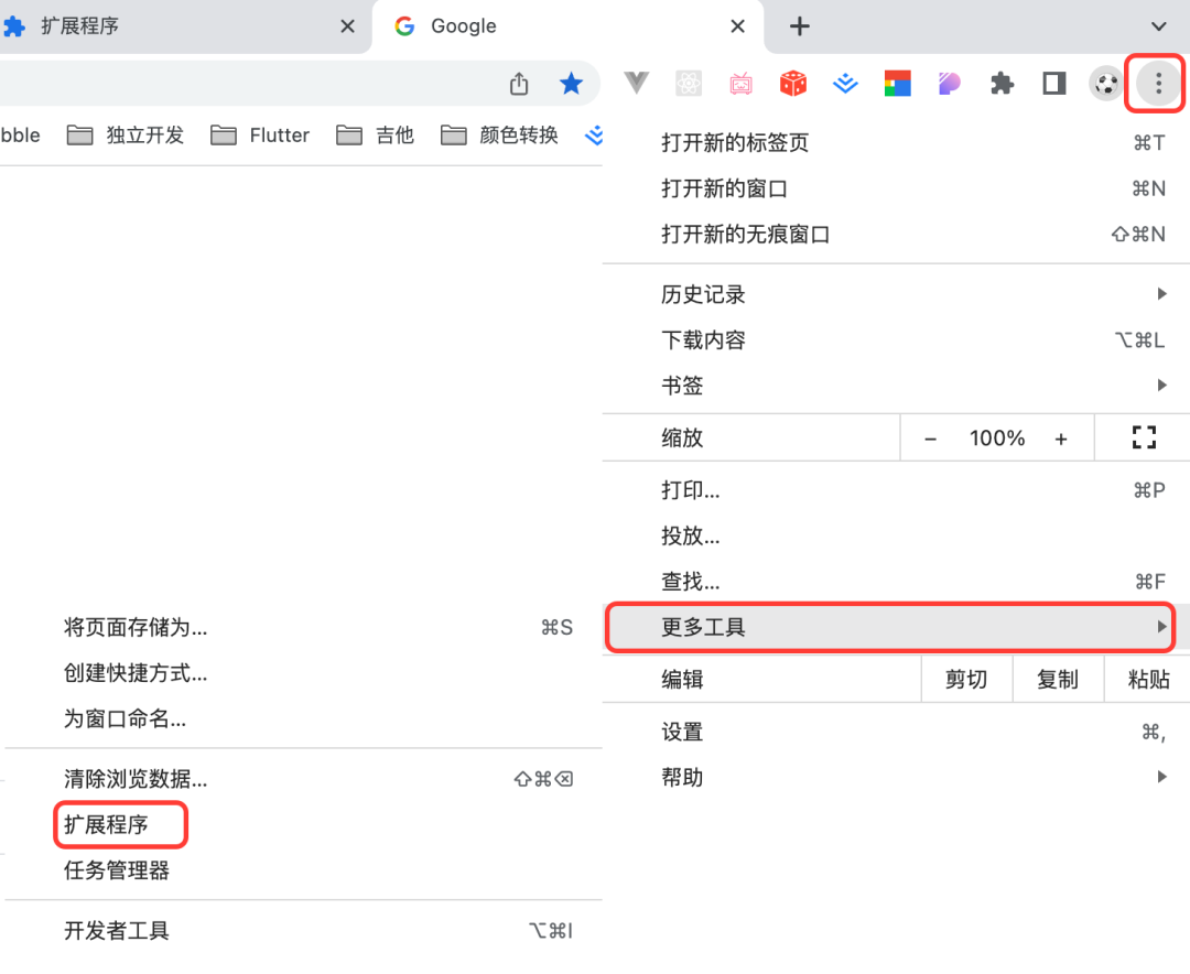 chrome://extensions。也可以通过下图的两种方式打开。