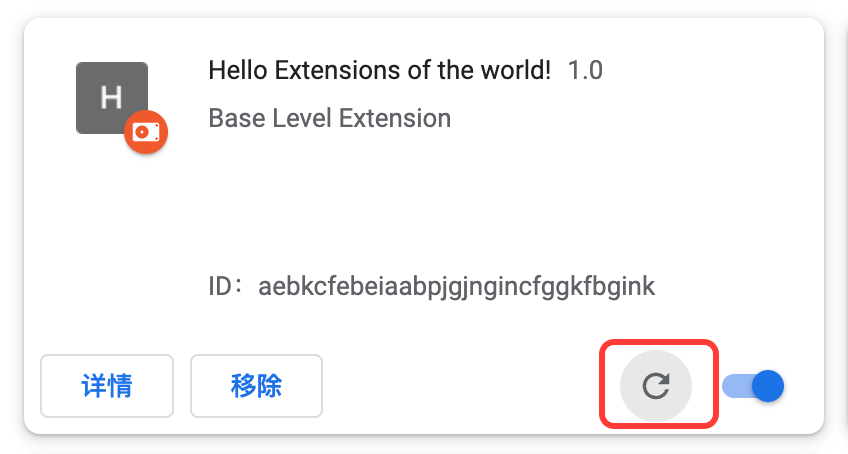{ "manifest_version": 3, "name": "Hello Extensions of the world!", ...}保存之后,回到扩展页面,点击刷新,可以看到,名字已经改变。那么每次改动都需要重新加载扩展吗?可以参考下表。