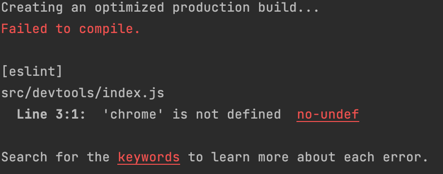 // paths.js+ devtoolsHtml: resolveApp('public/devtools.html'),+ devtools: resolveModule(resolveApp, 'src/devtools/index'),+ background: resolveModule(resolveApp, 'src/background/index'),+ content_script: resolveModule(resolveApp, 'src/content_scripts/index'),// webpack.config.js// dev 环境打包 service worker 等也没用,因为正常 web 页面中不会使用到entry: isEnvProduction ? { main: paths.appIndexJs, devtools: paths.devtools, background: paths.background, content_script: paths.content_script } : { main: paths.appIndexJs },// 配置 HtmlWebpackPluginnew HtmlWebpackPlugin( Object.assign( {}, { inject: true, filename: 'index.html', template: paths.appHtml, chunks: ['main'] } )),new HtmlWebpackPlugin( Object.assign( {}, { inject: true, filename: 'devtools.html', template: paths.devtoolsHtml, chunks: ['devtools'] } )),此时打包会报 eslint 的错误: