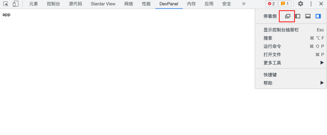 F12 打开控制台,选择 Devtools 面板单独打开浏览器进行调试: