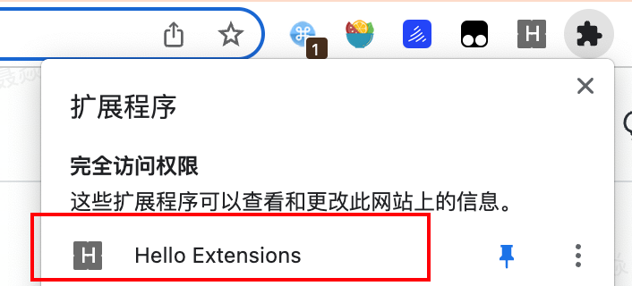 // hello-extensions/index.jsconsole.log('i am index.js in html');// hello-extensions/background/index.jsconsole.log('i am service worker');// hello-extensions/scripts/index.jsconsole.log('i am content script');至此一个最简单的 popup 插件就已经完成,点击右上角图标即可打开 popup 面板。