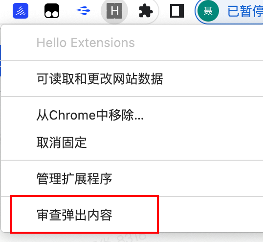我们右键点击右上角插件图标 -> 审查弹出内容即可进入插件的 html 页面中进行调试: