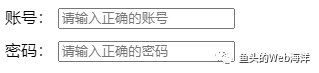 <form class="form" id="form" method="get" action="/api/form"> 账号: <input data-title="账号" placeholder="请输入正确的账号" pattern="\w{6,10}" >请输入正确的账号</span> <br /> 密码: <input data-title="密码" placeholder="请输入正确的密码" pattern="\w{6,10}" /></form>这里面的 HTML 标签都比较常规,但是我们要注意下 <input /> 所携带的几个属性:
