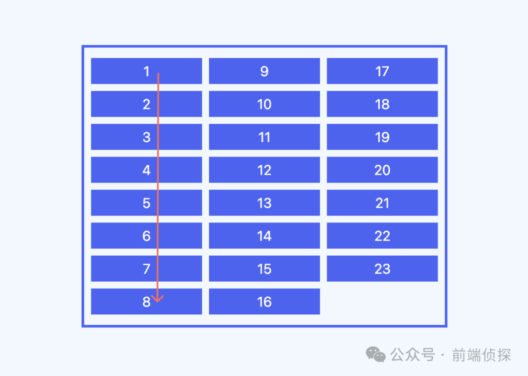 .list{ /**/ grid-auto-flow: column; grid-template-rows: repeat(8, 1fr);}这样就分成了N*8的网格,效果如下