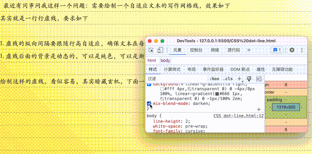 html{ background: linear-gradient(45deg, #f5ffc0, #fff);}body{ font-size: 20px; background: linear-gradient(to right, #fff 4px,transparent 0) 0 -4px/8px 100%, linear-gradient(#666 1px,transparent 0) 0 -1px/100% 2em; mix-blend-mode: darken;}这里使用了混合模式中的darken,这种模式可以去除白色部分,保留其他,效果如下
