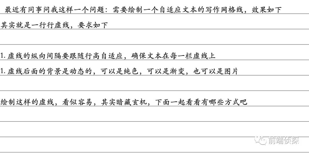 - 最近有同事问我这样一个问题:需要绘制一个自适应文本的写作网格线,设计稿是这样的