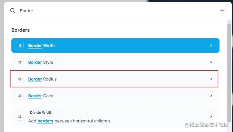 TailwindCSS 语法检索技巧 TailwindCSS 的基本原则是将每一个 style 语法转换为一个 class,因此,在官网检索想要的样式 class 时,按照样式的语法来检索是效率最高的。如想要获取圆角的语法,只需要搜索