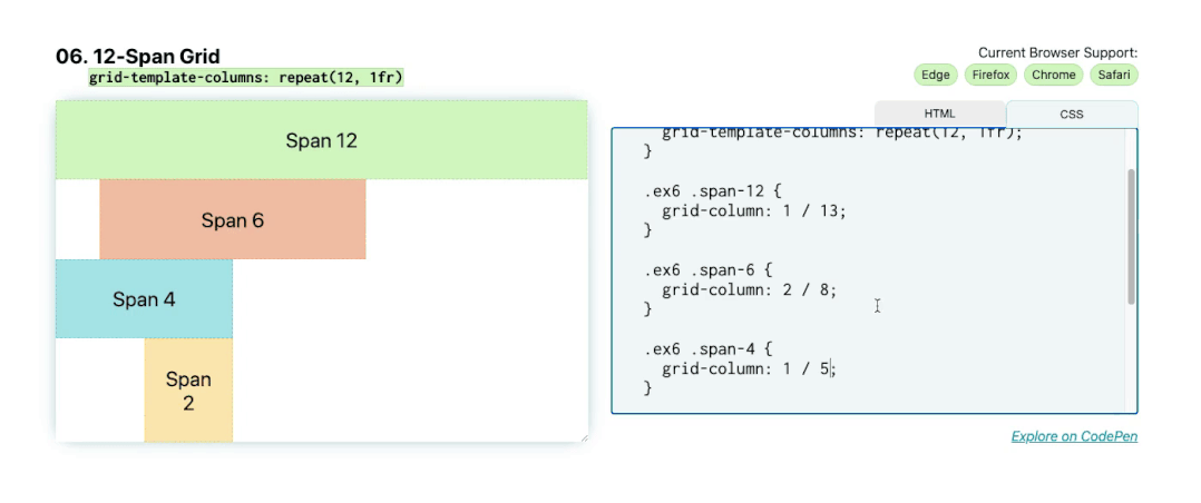 另一种方法是使用 span 关键字。使用 span ,您可以设置起始线,然后设置从该起点跨越的列数。在这种情况下,grid-column: 1 / span 12 将等效于 grid-column: 1 / 13 ,而 grid-column: 2 / span 6 将等效于 grid-column: 2 / 8 。