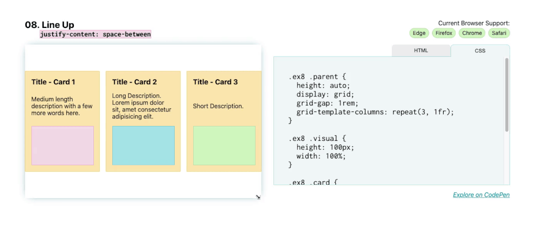 .parent { display: grid; grid-template-columns: repeat(auto-fill, minmax(150px, 1fr));}08. 排列布局:justify-content: space-between