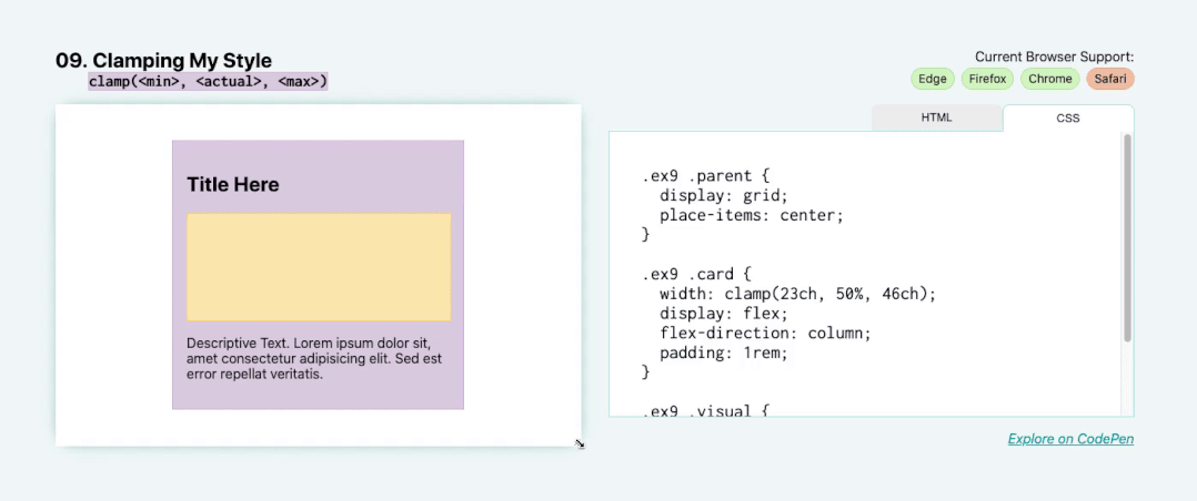 在这里, clamp() 函数所做的是使该元素保持 50% 的宽度,直到 50% 大于 46ch (在较宽的视口上)或小于 23ch (在较小的视口上)。您可以看到,当我拉伸和收缩父尺寸时,这张卡片的宽度会增加到其最大限制点并减小到其限制最小点。然后它保持在父级的中心,因为我们已经应用了其他的属性来将它居中。这可以实现更清晰的布局,因为文本不会太宽(超过 46ch )或太窄(小于 23ch )。