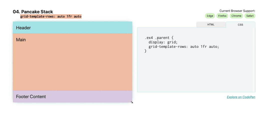 .parent { display: grid; grid-template-columns: minmax(150px, 25%) 1fr;}04. 煎饼堆栈布局:grid-template-rows: auto 1fr auto