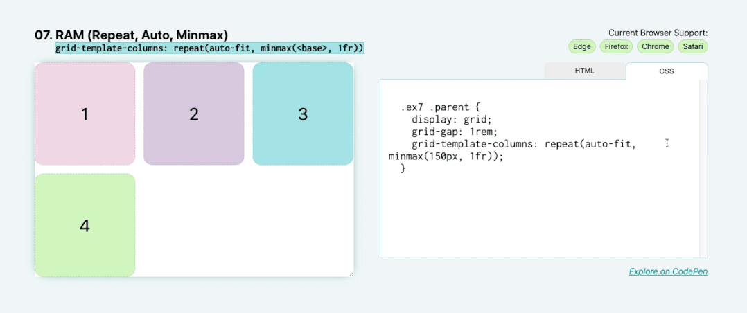 .child-span-12 { grid-column: 1 / span 12;}07. RAM (Repeat, Auto, MinMax): grid-template-columns(auto-fit, minmax(<base>, 1fr))