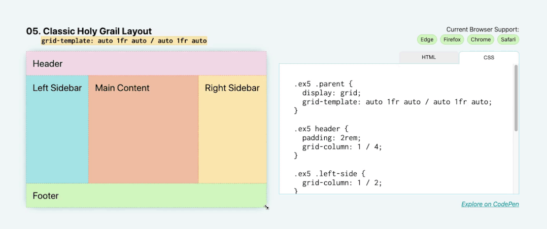 05. 经典圣杯布局:grid-template: auto 1fr auto / auto 1fr auto