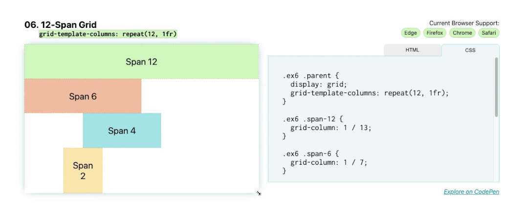 接下来我们有另一个经典布局:12 跨网格。您可以使用 repeat() 函数在 CSS 中快速编写网格。对网格模板列使用 repeat(12, 1fr); 将为每个 1fr 提供 12 列。