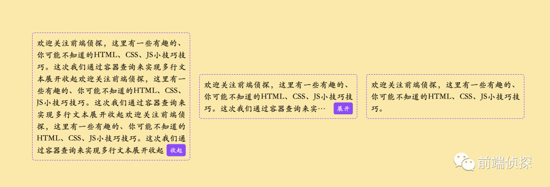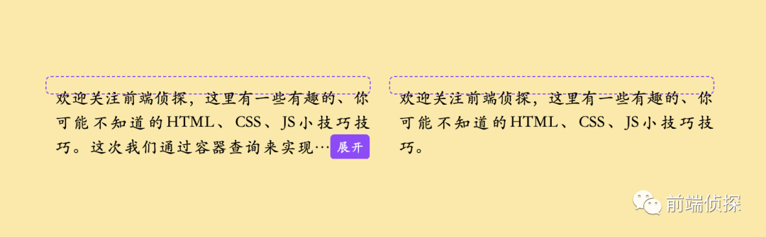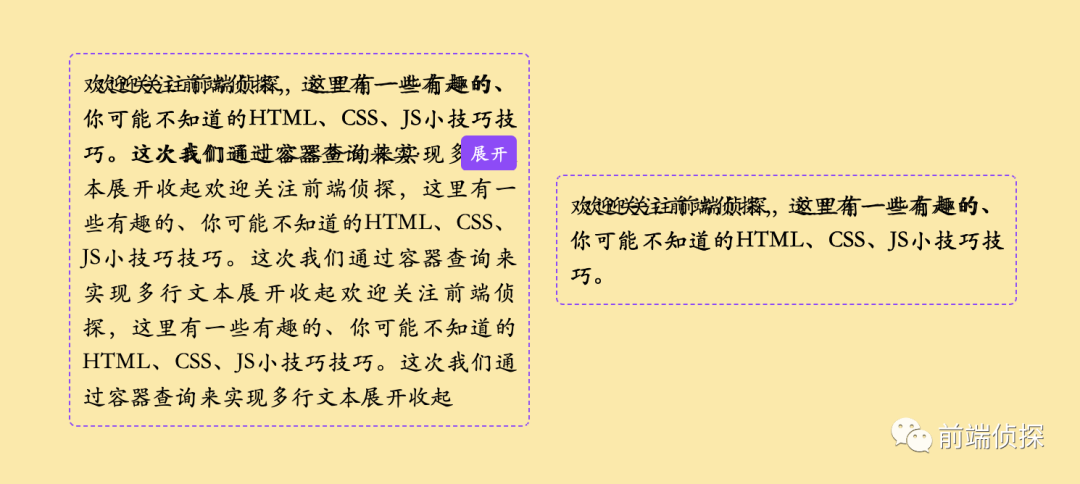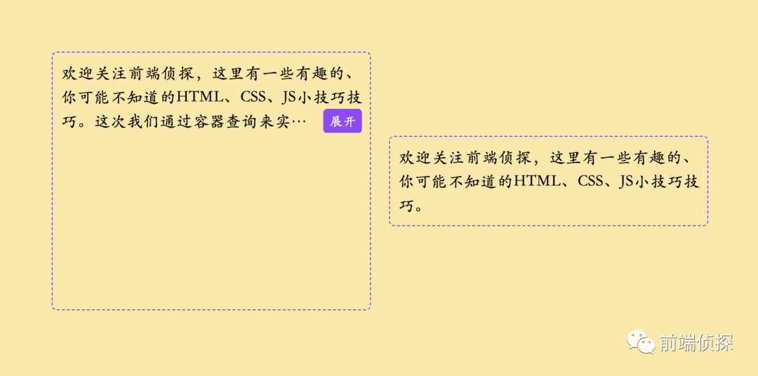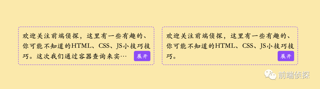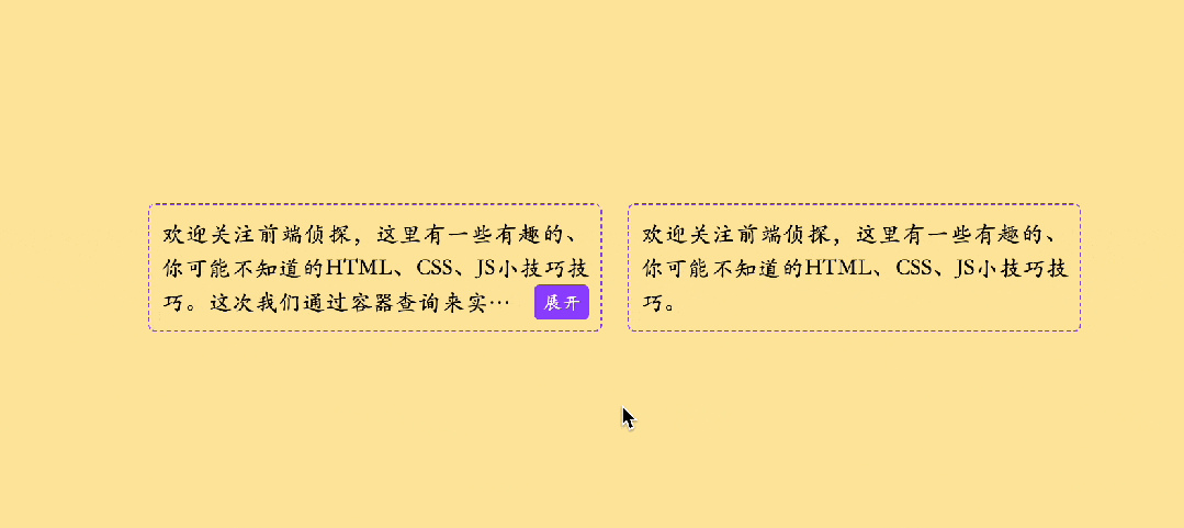 <div class="text-wrap"> <div class="text" title="欢迎关注前端侦探,这里有一些有趣的、你可能不知道的HTML、CSS、JS小技巧技巧。"> <div class="text-size"> <div class="text-flex"> <div class="text-content"> <label for="check" class="expand"><input type="checkbox" id="check" hidden></label> 欢迎关注前端侦探,这里有一些有趣的、你可能不知道的HTML、CSS、JS小技巧技巧。 </div> </div> </div> </div> </div>然后把.text-size座位容器查询盒子