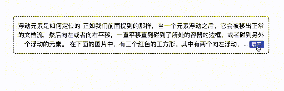 .text-wrap{ display: flex; position: relative; width: 300px; padding: 8px; outline: 1px dashed #9747FF; border-radius: 4px; line-height: 1.5; text-align: justify; font-family: cursive;}.expand{ font-size: 80%; padding: .2em .5em; background-color: #9747FF; color: #fff; border-radius: 4px; cursor: pointer;}.expand::after{ content: '展开';}.text-content{ display: -webkit-box; -webkit-box-orient: vertical; -webkit-line-clamp: 3; overflow: hidden;}.text-content::before{ content: ''; float: right; height: calc(100% - 24px);}.expand{ float: right; clear: both; position: relative;}.text-wrap:has(:checked) .text-content{ -webkit-line-clamp: 999;}.text-wrap:has(:checked) .expand::after{ content: '收起';}这样就得到了一个 “右下角” 可以展开收起的布局,不过目前按钮是始终可见的