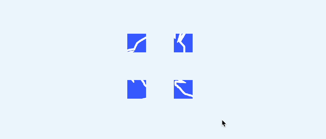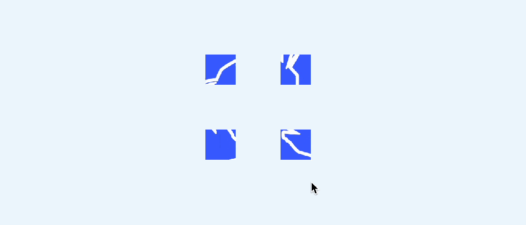 @keyframes r { 0%{ --d: 0% } 100%{ --d: 0%; --r: 90deg } 50%{ --d: 20% }}img:hover{ animation: r .5s;}这样也能实现相同的效果,下面分别是2*2、4*4、6*6的效果