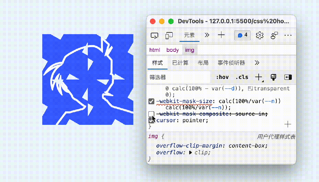 img{ --r: 30deg; --d: 30%; -webkit-mask: linear-gradient(var(--r), transparent var(--d),red 0 calc(100% - var(--d)), transparent 0), linear-gradient(calc(var(--r) + 90deg), transparent var(--d), red 0 calc(100% - var(--d)), transparent 0); -webkit-mask-size: calc(100%/var(--n)) calc(100%/var(--n));}变成了这样