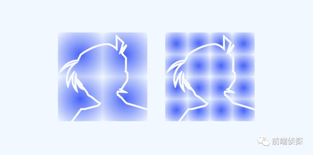 img{ --n: 4; -webkit-mask: radial-gradient(black, transparent); -webkit-mask-size: calc(100% / var(--n)) calc(100% / var(--n));}这里用了一个径向渐变做了遮罩图片,遮罩尺寸是100% / var(--n),刚好将完整的图片分成了n*n份,效果如下,分别是2*2和4*4的效果