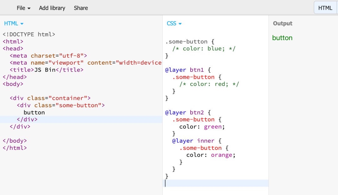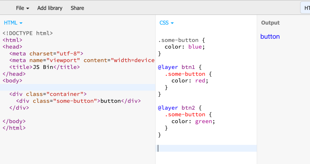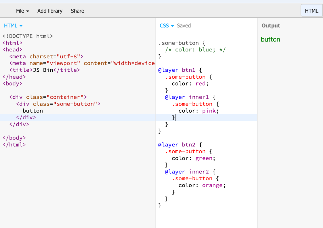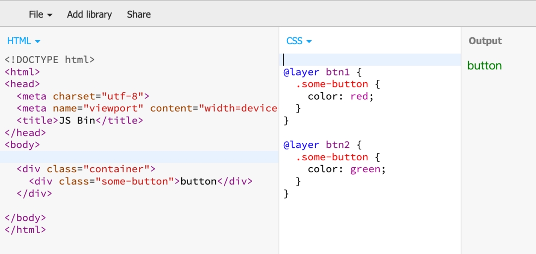 我们依然举前面的例子,使用 @layer 前 vs 使用 @layer 后,显然 @layer 的管理更灵活,更清晰: