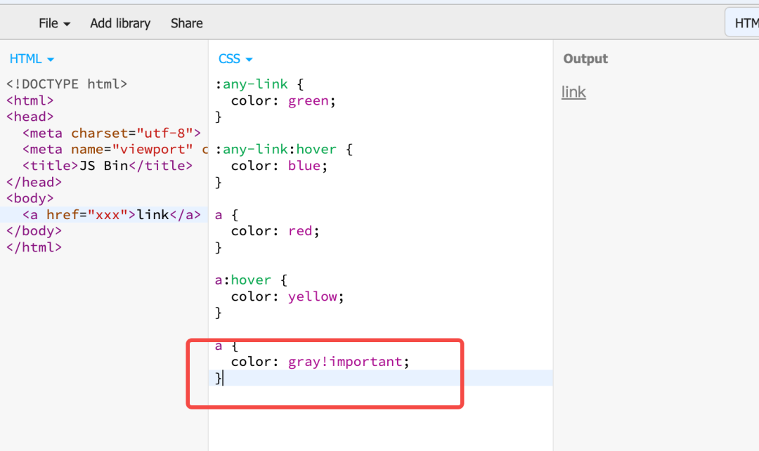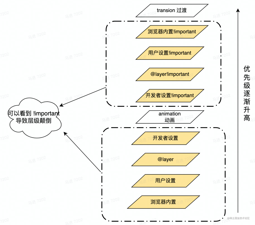 上图中已经看到层级规则中带 !important 的存在其规律:
