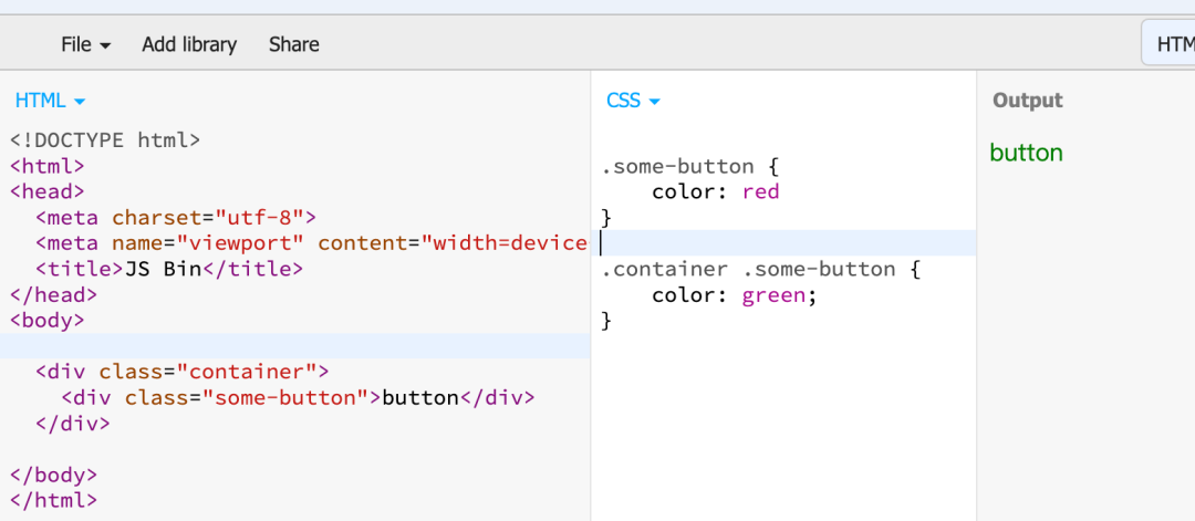 <div class="container"> <div class="some-button">button</div></div>.some-button { color: 'red'}覆盖后可能是下面这样的,如果场景多了会导致代码变得很臃肿,复杂选择器 会让 css 渲染性能变差: