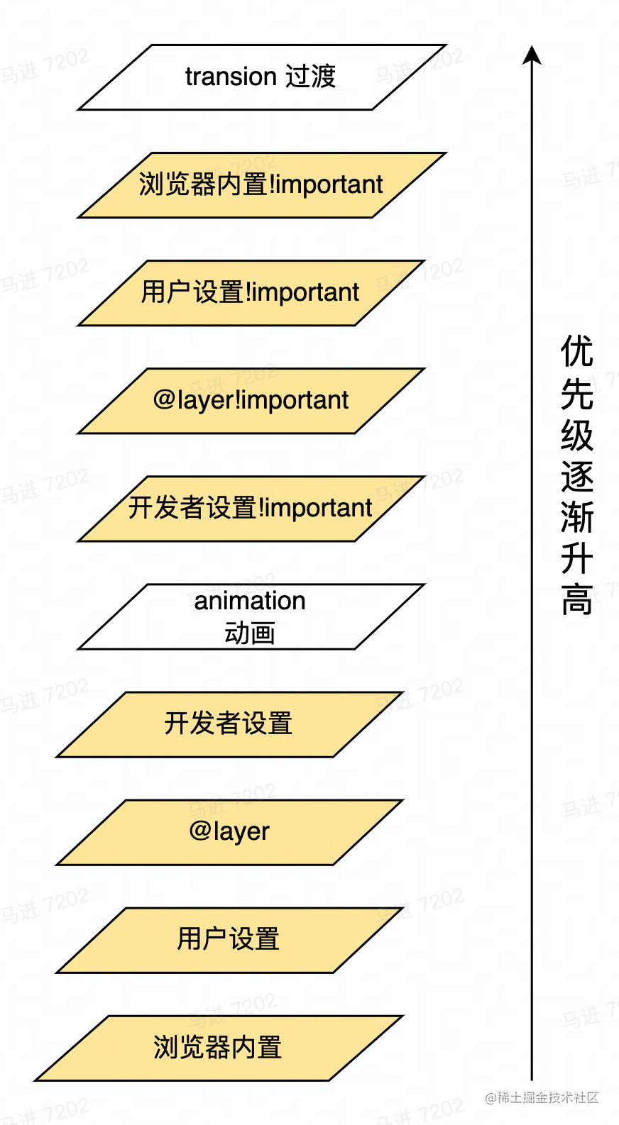 在默认情况下,@layer 规则内 CSS 声明的优先级是按照前后顺序来的
