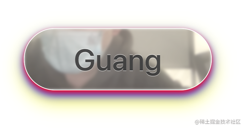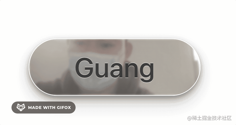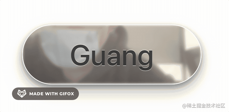 :root { --transition: 0.1s; --border-radius: 56px;}.button-wrap { width: 300px; height: 100px; position: relative; transition: transform var(--transition), box-shadow var(--transition);}.button-wrap.pressed { transform: translateZ(0) scale(0.95);}.button { width: 100%; height: 100%; border: 1px solid #fff; overflow: hidden; border-radius: var(--border-radius); box-shadow: 0px 4px 8px rgba(0, 0, 0, 0.25), 0px 8px 16px rgba(0, 0, 0, 0.15), 0px 16px 32px rgba(0, 0, 0, 0.125); transform: translateZ(0); cursor: pointer;}.button.pressed { box-shadow: 0px -1px 1px rgba(0, 0, 0, 0.5), 0px 1px 1px rgba(0, 0, 0, 0.5);}.text { position: absolute; left: 50%; top: 50%; transform: translate(-50%, -50%); pointer-events: none; color: rgba(0, 0, 0, 0.7); font-size: 48px; font-weight: 500; text-shadow:0px -1px 0px rgba(255, 255, 255, 0.5),0px 1px 0px rgba(255, 255, 255, 0.5);}这种 button 大家写的很多了,也就不用过多解释。