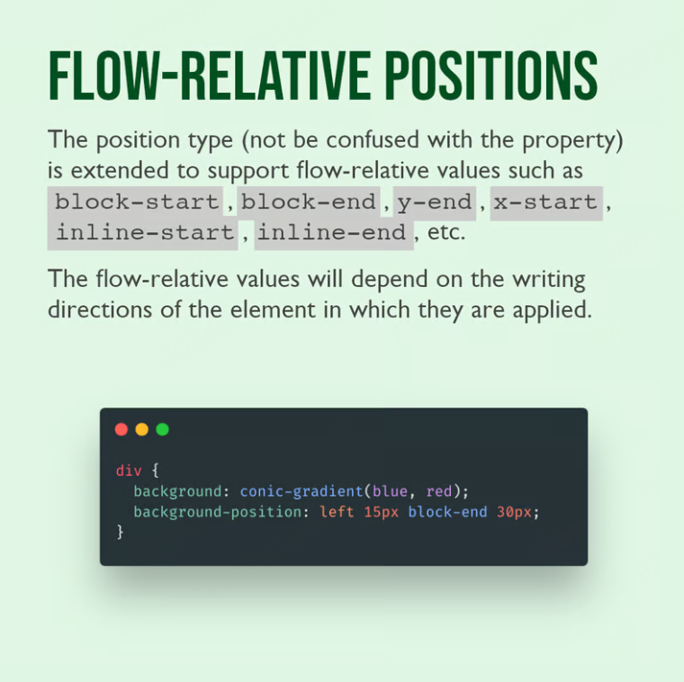 CSS 已经有用于 margin、padding 和 border 的逻辑属性——这些值与文本书写方向相关,并且可能因语言而异。现在这被引入到 position 类型(不要与 position 属性混淆)。表示位置的属性(例如,background-position、object-position 等)可以指定相对于文本流和方向的值。