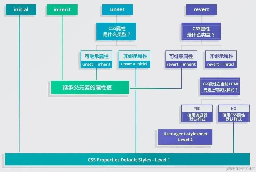 在 CSS 中提供了处理 CSS 继承的机制,简单地讲就是 CSS 提供了几个属性值,可以用来处理属性的继承。这几个属性值就是initial、inherit、unset 和 revert。其实除了这四个属性值之外,还有一个 all 属性值。虽然这几个属性值主要用来帮助大家处理 CSS 属性继承的,但他们之间的使用,还是有一定的差异化。先用一张图来阐述它们之间的差异: