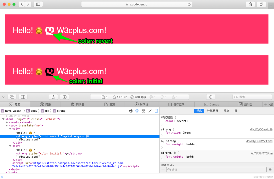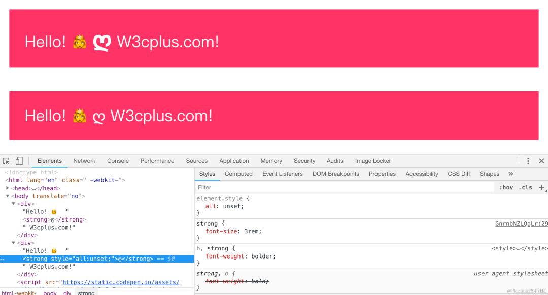 效果中的第一个是没设置all:unset,第二个设置了all:unset。这个时候strong元素的font-size和font-weight继承了其父元素的font-size和font-weight。