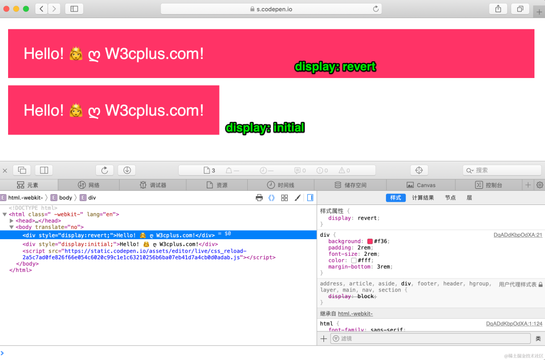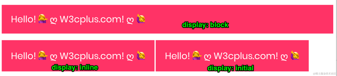 根据前面介绍的,就算是我们在 div 中显式的设置 display:revert,该元素也将使用用户代理规则中的 display:block 样式。同样,我们在另一个 div 元素中使用 display:initial ,根据前面介绍的,那在这个 div 将会采用 display 的初始值 inline 。比如下面的效果: