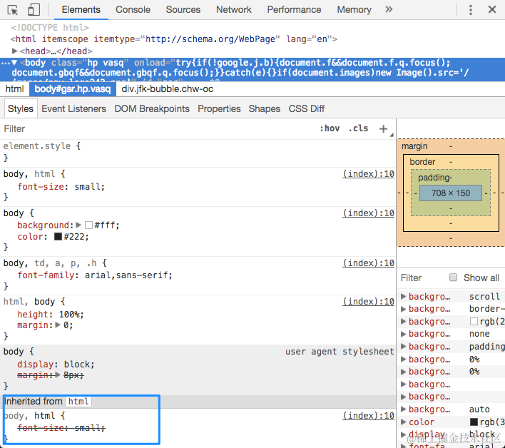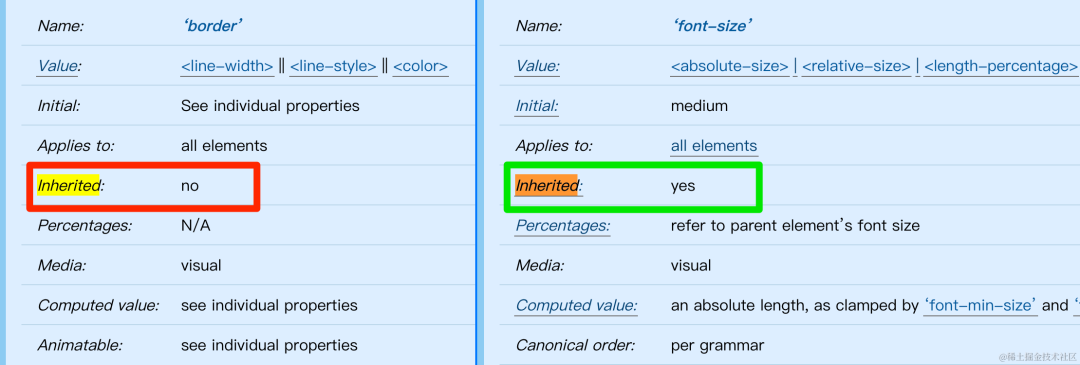 上图蓝框中告诉 body 元素继承 html 元素的 font-size: small;。开发者工具中会提示我们 “Inherited from html”。那么问题来了,在 CSS 中哪些属性是会被继承的?其实在 W3C 规范中各个属性的描述已经很清楚的告诉我们了。比如说 border 属性,在描述其语法时,在列表中有一个 Inherited 描述项的值为 no。这也就告诉我们 border 属性是不能被继承的。反之,再看 font-size 属性,语法描述的列表中同样有一个 Inherited 描述项,只不过它的值不是 no,而是 yes,也就是说 font-size 属性是会被继承的。
