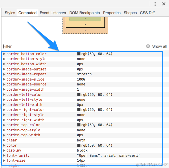 如果你感兴趣的话,可以打开浏览器的开发者工具,查看对应的计算值(比如,Chrome 开发者工具,有一个 Computed 选项,该选项展示的就是对应的 CSS 计算值),如下图所示: