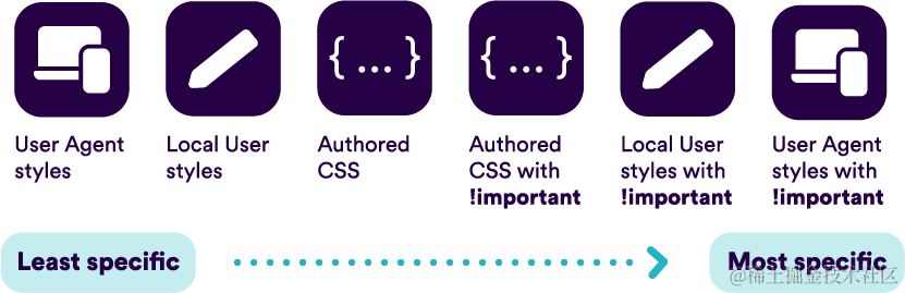 CSS 层叠在判断哪个声明获胜时考虑这两个属性的组合。每个组合都有一个权重(类似声明的部分权重),权重最高的规则获胜。以下是浏览器考虑的各种来源和重要性的组合,按从最高权重到最低权重的顺序列出: