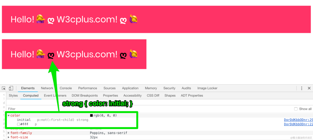 接下来,我们再来看一个继承属性 color。所以 <p> 元素的后代元素 <strong> 也会继承 <p> 元素中设置的 color: #fff 值。如果我们显式的在 strong 中设置 color 的值为 initial 时,那么 strong 的 color 将重置为默认值。由于我们没有设置默认的 color 颜色,那么这个时候,浏览器将会把一个计算值赋予成 color 的初始值: