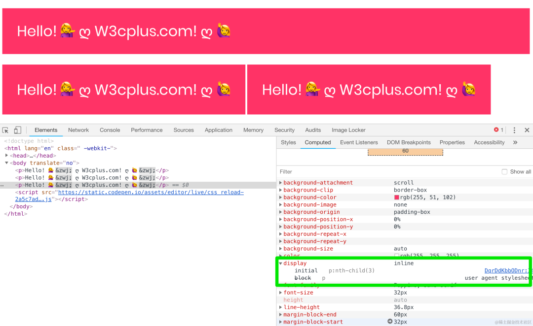 如果我们通过浏览器检查器中的计算值(Computed)一项可以看出来,display 设置为 initial 时,会覆盖用户代理的样式值 block: