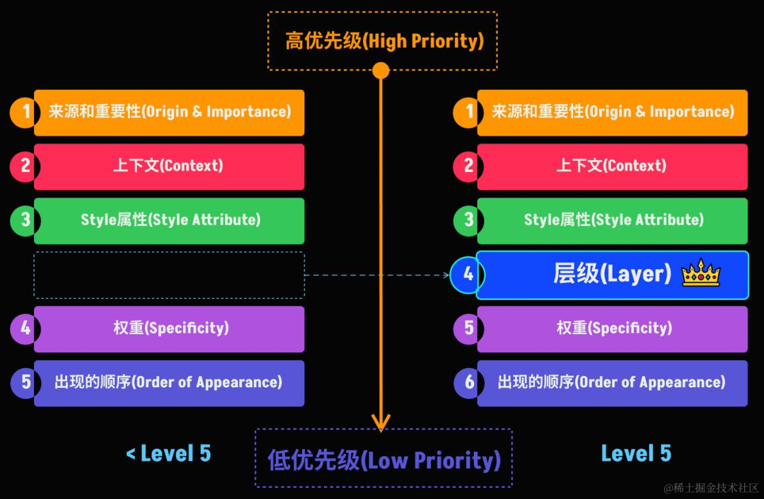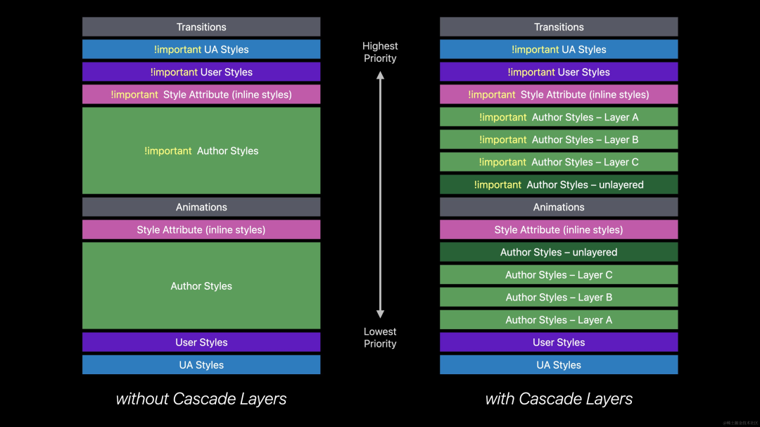 我使用下图来阐述有级联层 @layer 前后,CSS 级联的差异: