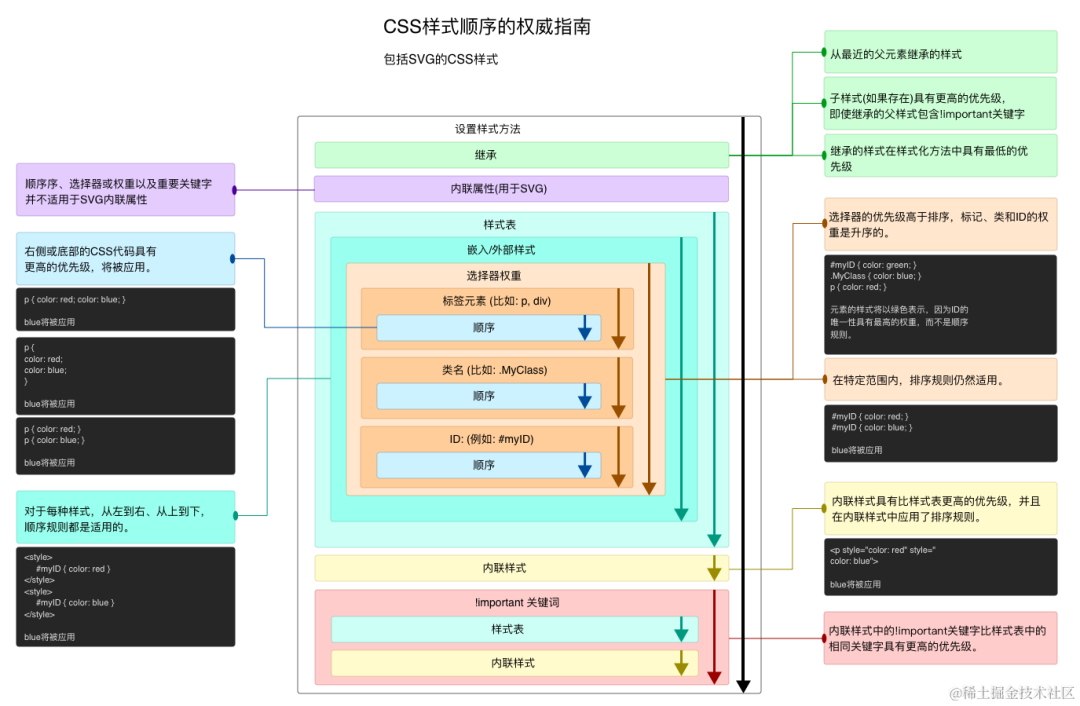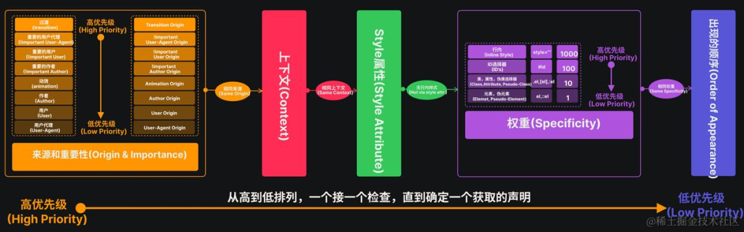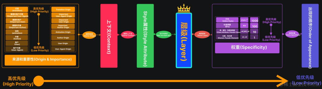 简单的说,当多个相互冲突的 CSS 声明应用于同一个元素时,CSS 层叠算法会根据一定的机制,从最高权重到最低权重的顺序列出: