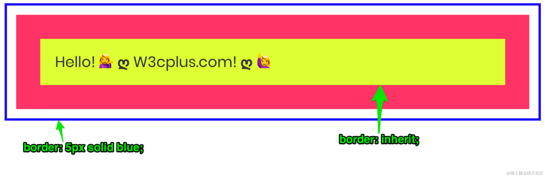 <div class="wrapper" style="border:5px solid blue;"> <div style="border: inherit;">...</div></div>得到的效果将是一样的: