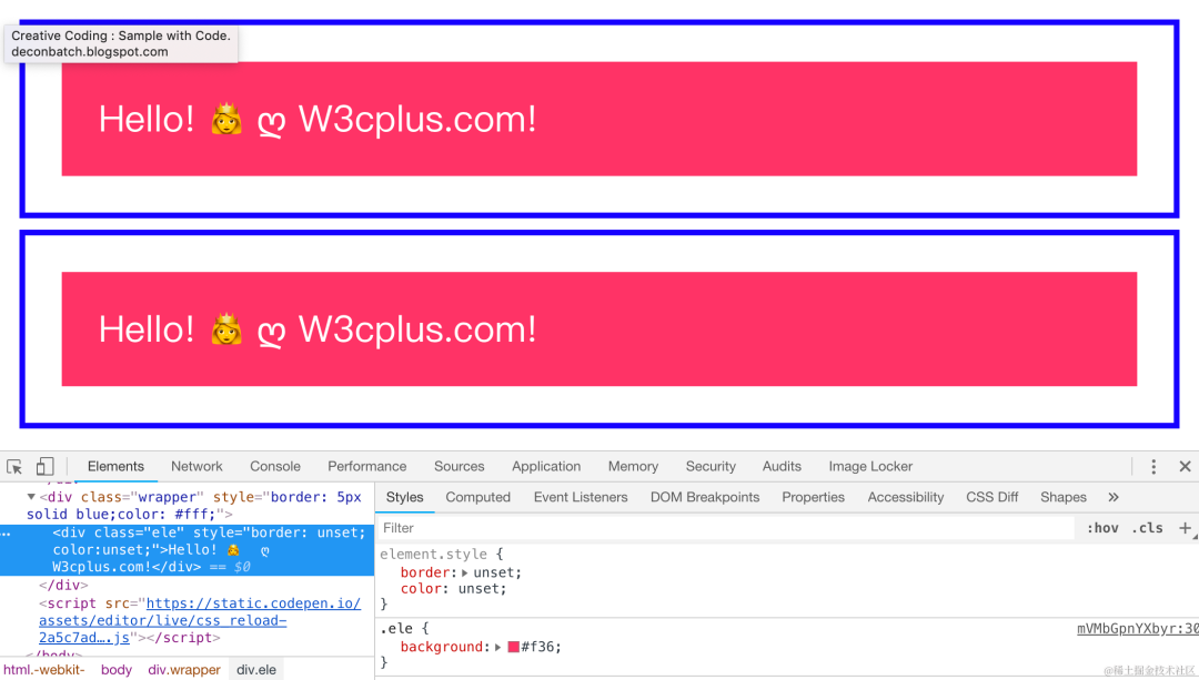 <div class="wrapper" style="border: 5px solid blue;color: #fff;"> <div class="ele" style="border: unset; color:unset;">...</div></div>div.ele 元素的 border 和 color 都设置了 unset 值。也就是说它将运用 initial 或者 inherit 的值。具体取决于哪个值,这得根据属性的默认行为是什么来决定。如果默认属性是 inherit,那将运用的是 inherit;如果默认属性是 initial,那将运用的是 initial。