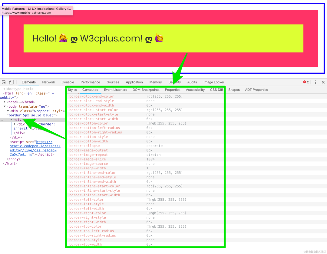 可以看到 div.ele 仅继承了其父元素 div 的 border 属性的计算值,并未继承其祖先元素 .wrapper 的border 属性的设置值,通过浏览器开发者工具,可以看得一目了然: